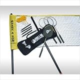 Everything you need to start playing doubles badminton is in the Park and Sun Badminton Pro Set.This regulation badminton net is supported by two 1.5 inch poles and two 10 inch ground stakes for complete stability.The included boundary lines help you set up a court without the need for measuring, and the included set of four steel rackets and three shuttlecocks mean you can start playing right away.